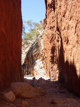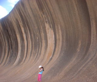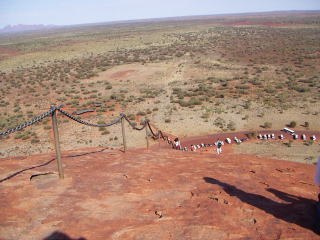 現地名「ウルル」。誰もが知っているであろう、砂漠の中に突如現れる巨大な1枚岩。自然の不思議さと驚きをかもし出す絶景です。オーストラリアの中心に位置し、アボリジニーの聖地です。外周を周るにもかなりの距離があるため、車でまわるのが一般的です。登ることは許可されていますが、アボリジニーの人たちからすると聖地ゆえ登って欲しくないのが本音です。もうすぐ登ることが禁止されるという話を聞きますが、観光資源でもあり、政府も苦悩しているところでしょう。登り降り口は1箇所であり、急な斜面につかまるための鎖が途中まである程度であり、整備はされていません。リスクは自分自身で負わなければなりません。上に行っても登山道は整備されておらず、岩肌はかなりすべるため注意が必要です。とはいいつつ、日本から多数のおばさん・おじさんがツアーで列をなして登っています。意外とおばさんは根性があります。すれ違いざまに、「がんばって」とこちらが声をかけられました。登るに際し、風速や温度など制限がもうけられることがあり、日中は高温のため禁止時間となります。何日か滞在し、やっと登れるということもあります。