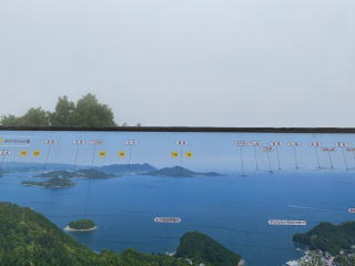 最終日、レンタカーを借りしまなみ海道を目ざす。広島駅から1時間半位高速を走り、尾道から最初の橋を渡り向島へ。高見山展望台を目ざし山を登って行くが、霧が深くなっていく。頂上の展望台にたどり着いたときは、視界10メートル位で、真っ白な世界。パノラマ地図を見ながら、あっちが瀬戸内海と島が見えるはずだと妄想。せっかく来たので、もう少ししまなみ海道を四国方面に南下。因島、生口島、大三島まで渡った。流石にこの天気のため、橋添いの自転車道を走っているサイクリング者はちらほら程度。天気が良ければ最高だろうな。少しづつ天気が良くなり、青空も見え始めた。道の駅「多々羅しまなみ公園」で瀬戸内海と大橋を眺める。ここは、愛媛県今治市。お土産も未完など柑橘類が目立つ。四国に来たんだなと感じさせてくれた。尾道まで戻り、昼食に尾道ラーメンを食べる。ここでも、どこのラーメン屋さんも長蛇の列。「丸ぼし」さんに並ぶこと1時間以上。煮干しスープのラーメンと唐揚げ美味しかった。尾道から向島までは直ぐそこに見える。 カーフェリーも出ており、日常の足として使われているんだろう。広島空港まで戻り羽田は19:30着。良く歩き、よく並び、よく食べた小旅行でした。