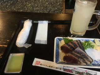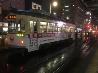 これから、どの位かかるか調べていなかった高知まで移動しなければならない。松山まで戻り高速で行くか、一般道を選び海沿いに南下するか最短距離の山越えで東に進むか迷ったが、最短距離を選ぶとことにした。村(?)をいくつか通り越し、一般道を130km走り約3時間で高知市に着いた。ここも路面電車だ。路面電車に乗り、夕食に出かけた。「土佐の〜高〜知の〜」の「はりまや橋」を見て、炙ったかつおのたたきと柚サワーで一杯。今日は250kmのドライブだが、旨いかつおで元気回復。