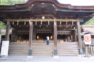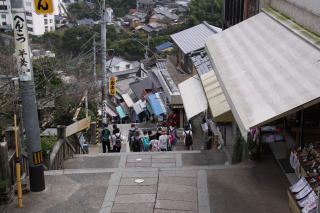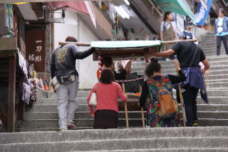 ホテルから金毘羅さんに向かい門前町を散策。老舗のうどん屋にて本場の讃岐うどんが朝食だ。いざ神殿に向け、これから参道の階段が続く。昔、遠方のため参拝に行くことができない人が、飼い犬に代わりに参拝にいってもらう風習があったそうだ。その銅像が階段入り口にある。とにかくひたすら階段を上り続ける。登って登って、やっと御本宮に到着。ここからの眺め、平野の先に山が一望できる。だいぶ疲れはしていたものの、奥の神社(厳魂神社)まで足を延ばした。これがまた辛い階段だ。元気良い高校生の集団についていこうとしたが、どんどん離される。着いた時には汗でビショビショだ。参道入口からここまで1368段の石階段だそうだ。帰りは下りのため、周りを見ながら下って行いった。階段の両脇には小さいお店が一杯だ。参拝者のための籠屋さんもいる。担いで登っていくのは、たいへんな重労働だ。載っている人も大変だと思う。なお、杖があちこちのお店にて無料で借りられる。お参りがすみ、これから徳島県の秘境の地である祖谷渓(いやけい)に向かう。その前に、昼食のためうどん屋を探す。有名所を探し行ってみたが定休日。3件目でやっと再度讃岐うどんにありつけた。近所の仕事人の方々がお客であり、現地のうどん屋を味わうことができた。丸亀製麺と同じで、並んでうどんの種類を伝え、出来上がりを取り、天ぷらを選ぶことができ、最後に支払いだ。