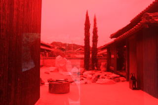 小豆島からフェリーにて豊島(てしま)へ渡る。手前の唐櫃(からと)港では降りず先の家浦港で下船。豊島は瀬戸内海でも大きな島だが、人口は900人ほどであり、芸術観光でなりたっていると店のおじさんが言っていた。レンタルバイク(セトウチカレン)で島内の自然を満喫したかったがあいにく雨模様で断念。そこで紹介してもらった2つの美術館を見てきた。2つとも港のそばにある。豊島横尾館、古民家をアトリエにしたもので、赤色の不思議な世界に入り込んだ。2つ目は、こちらも古民家をアトリエにした黒・白・黄色のこれまた不思議な世界に入り込める。どう表現してよいのやら、これぞ芸術だ。